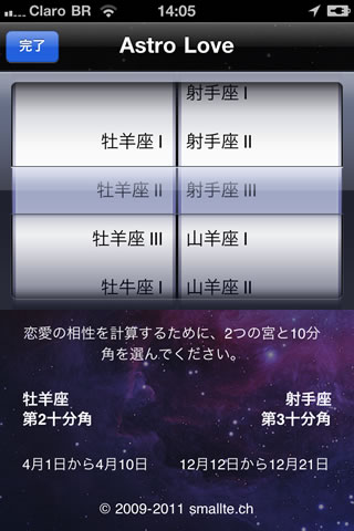 このアプリケーションは、素敵な恋にめぐり合うとか愛情を感じるなどの恋愛運を計算します。お互いの星が近ければ近いほど、恋愛運がいいということ。絶好のタイミングを見逃さないで!